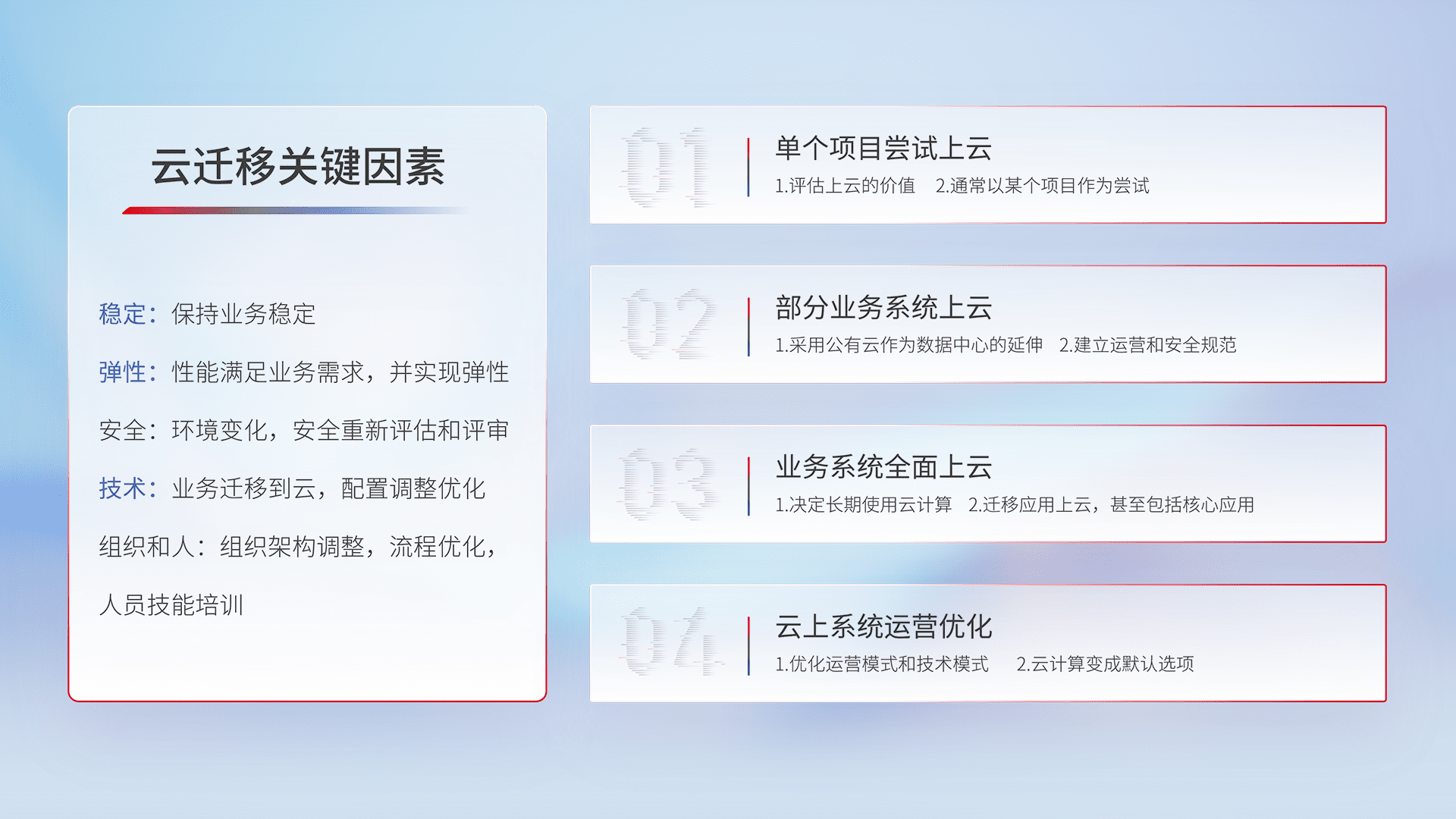 结合实际业务,,从规划设计、、云平台选型、、、、云原生改造、、、数据迁移、、集成交付,,迁移全过程为客户识别最佳上云路径,,,,做好风险识别管理,,设计网络架构、、、身份权限、、、安全审计合规、、操作审计、、、、日志审计、、、监控告警策略、、、、多站点容灾设计等,,,对云上基础设施进行整体规划,,提升IT治理水平,,以满足弹性、、、高可用、、高性能的需求。。